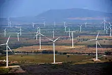The earliest human artifacts in Mexico are chips of stone tools found near campfire remains in the Valley of Mexico and radiocarbon-dated to circa 10,000 years ago.[37] Mexico is the site of the domestication of maize, tomato, and beans, which produced an agricultural surplus. This enabled the transition from paleo-Indian hunter-gatherers to sedentary agricultural villages beginning around 5000 BCE.[38] In the subsequent formative eras, maize cultivation and cultural traits such as a mythological and religious complex, and a vigesimal (base 20) numeric system, were diffused from the Mexican cultures to the rest of the Mesoamerican culture area.[39] In this period, villages became more dense in terms of population, becoming socially stratified with an artisan class, and developing into chiefdoms. The most powerful rulers had religious and political power, organizing the construction of large ceremonial centers.[40]