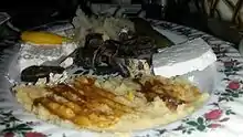 Meze (also spelled mezze or mezé) (/ˈmɛz/, /ˈmɛzɛ/) is a selection of small dishes served as appetizers in Albanian, Bosnian, Armenian, Kurdish, Levantine, Turkish, Bulgarian, Greek, Iraqi, Egyptian, Balkan, Caucasian and Persian cuisine, to name a few.[1][2] It is similar to Spanish tapas and Italian antipasti.[3] A mezze may be served as a part of a multi-course meal or form a meal in itself. In non-Islamic countries, or in areas without alcohol restrictions, mezze are often served with spirits such as arak, raki or grappa.