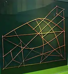 The people of the Marshall Islands have a history of using stick charts, to serve as spatial representations of islands and the conditions around them; with the curvature and meeting-points of the coconut ribs indicating the wave motion that was the result of islands standing in the path of the prevailing wind and the run of the waves.[2][3] The charts represented major ocean swell patterns and the ways the islands disrupted those patterns, typically determined by sensing disruptions in ocean swells by islands during sea navigation. Most stick charts were made from the midribs of coconut fronds that were tied together to form an open framework. Island locations were represented by shells tied to the framework, or by the lashed junction of two or more sticks. The threads represented prevailing ocean surface wave-crests and directions they took as they approached islands and met other similar wave-crests formed by the ebb and flow of breakers. Individual charts varied so much in form and interpretation that the individual navigator who made the chart was the only person who could fully interpret and use it.[27] The use of stick charts ended after World War II when new electronic technologies made navigation more accessible and travel among islands by canoe lessened.[22]