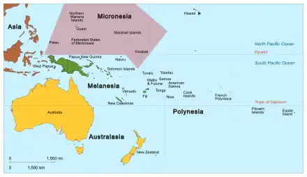 Micronesian navigation techniques are those navigation skills used for thousands of years by the navigators who voyaged between the thousands of small islands in the western Pacific Ocean in the subregion of Oceania, that is commonly known as Micronesia. These voyagers used wayfinding techniques such as the navigation by the stars, and observations of birds, ocean swells, and wind patterns, and relied on a large body of knowledge from oral tradition.[1][2][3] These navigation techniques continued to be held by Polynesian navigators and navigators from the Santa Cruz Islands.[4] The re-creations of Polynesian voyaging in the late 20th century used traditional stellar navigational methods that had remained in everyday use in the Caroline Islands.