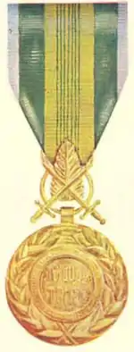 The Military Merit Medal (Vietnamese: Quân công Bội tinh) was the highest military decoration bestowed to enlisted personnel by the Republic of Vietnam during the years of the Vietnam War. The medal was established on August 15, 1950. The Military Merit Medal was modeled after the French Médaille Militaire and was awarded mostly to Enlisted Men for valor in combat.[3] The medal had three different versions, coincided with the political change in South Vietnam: the State of Vietnam, the First Republic, and the Second Republic version.[1] The Vietnamese National Order of Vietnam was considered the equivalent decoration for military officers.