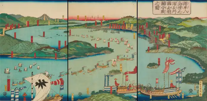 The Imperial family struggled against the control of the Fujiwara clan, which almost exclusively monopolized the post of regent (Sesshō and Kampaku). Feudal conflicts over land, political power, and influence eventually reached its apex in the Genpei War (1180–1185). This was a national civil war between the two most powerful clans: the Taira and Minamoto clans.[21] They fought for control over the declining Imperial Court in Kyoto. Each side had a large number of smaller allied clans. The Battle of Dan-no-Ura was a major naval battle between these clans on April 25, 1185. Minamoto had a fleet of 300 ships and Taira had 400 to 500 ships. It resulted in a decisive victory for the Minamoto clan and the destruction of the Taira clan.[22] The end of the Genpei War brought the end of the Heian period and the beginning of the Kamakura period.