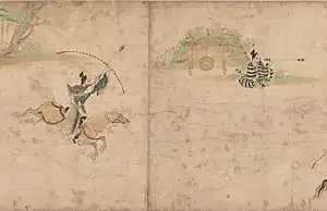 In the 13th century, the Mongols conquered and controlled China under the Yuan dynasty. Subsequently, they attempted to invade Japan twice. In early October 1274, the Battle of Bun'ei began with a combined force of Mongols and Koreans. They arrived on ships and seized the Japanese islands Tsushima, Iki island, Hirato island, Taka and Nokono. The Mongols slaughtered the inhabitants of Tsushima and about 1000 Japanese soldiers were killed on Iki island.[31] When the Mongols arrived on Japan's mainland of Kyushu they encountered the first real Japanese army.[32] During the Battle of Akasaka the Japanese won with a surprise attack by the forces of Kikuchi Takefusa. The second victory was at the Battle of Torikai-Gata where the samurai of Takezaki Suenaga and Shiraishi Michiyasu killed 3,500 Mongols.[33] The Mongol army and Hong Dagu withdrew to their ships towards the Yuan Dynasty. The Japanese army conducted night attacks and killed as many soldiers as they could. On the night of October 19, a typhoon caused one-third of their returning ships to sink and many Mongol soldiers drowned. This typhoon was called the Kamikaze which means "divinely conjured wind".[34][35]