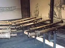 Due to the conflict-ridden nature of the Philippine archipelago, warriors were forged in the many wars in the islands, thus the islands acquired a reputation for its capable mercenaries, which were soon employed all across South and Southeast Asia with some influence even manifested in East Asia at Japan where Lucoes sailors initially guided Portuguese ships to the Shogunate[35] and even South Asia in Sri Lanka where Lungshanoid pottery from Luzon were found in burials there.[36] Lucoes (warriors from Luzon) aided the Burmese king in his invasion of Siam in 1547 AD. At the same time, Lusung warriors fought alongside the Siamese king and faced the same elephant army of the Burmese king in the defense of the Siamese capital at Ayuthaya.[37] The former sultan of Malacca decided to retake his city from the Portuguese with a fleet of ships from Lusung in 1525 AD.[lower-alpha 1]