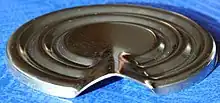 A milk watcher is a disk with a raised rim notched on one side. Some milk savers are designed so they can be used with the obverse or reverse side facing up and appear to have two notches. The interior of the disk slants upward toward the notched side, creating a space just behind the notch where water vapor can collect. Water vapor trapped under the milk saver causes the notched side to rise up, releasing the water vapor and making a rattling noise as the saver falls back into contact with the base of the pan.[1][2]
