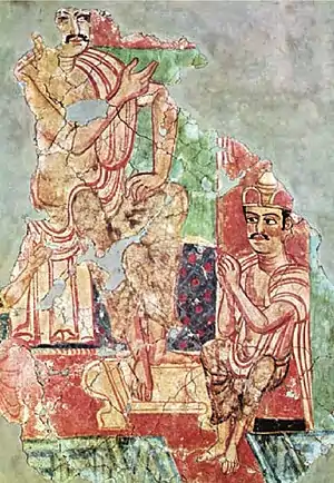 This Romanesque style is thought to be the work of a Buddhist painter known as "Titus" (𐨟𐨁𐨟, Tita), who signed his painting at Miran with his name in Indian Kharoshti characters, and who was perhaps a Roman artist who traveled east along the Silk Roads in search of employment.[9][10][11] Several artefacts have been found at the Miran site, including bows and arrows.[12]