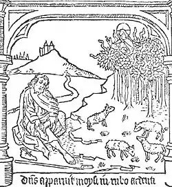 Moses taking off his shoes in front of the burning bush (illustration from a 16th-century edition of the Speculum Humanae Salvationis).
