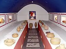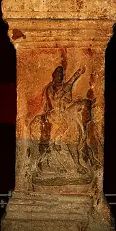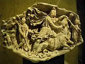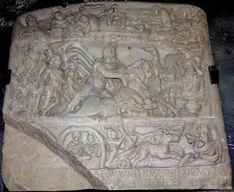 In some depictions, the central tauroctony is framed by a series of subsidiary scenes to the left, top and right, illustrating events in the Mithras narrative; Mithras being born from the rock, the water miracle, the hunting and riding of the bull, meeting Sol who kneels to him, shaking hands with Sol and sharing a meal of bull-parts with him, and ascending to the heavens in a chariot.[26] In some instances, as is the case in the stucco icon at Santa Prisca Mithraeum in Rome, the god is shown heroically nude.[lower-alpha 19] Some of these reliefs were constructed so that they could be turned on an axis. On the back side was another, more elaborate feasting scene. This indicates that the bull killing scene was used in the first part of the celebration, then the relief was turned, and the second scene was used in the second part of the celebration.[28] Besides the main cult icon, a number of mithraea had several secondary tauroctonies, and some small portable versions, probably meant for private devotion, have also been found.[29]