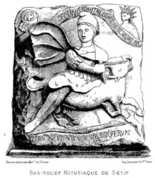 Based on dedicatory inscriptions for altars, the name of the figure is conjectured to be Arimanius, a Latinized form of the name Ahriman[lower-alpha 20] – perplexingly, a demonic figure in the Zoroastrian pantheon. Arimanius is known from inscriptions to have been a god in the Mithraic cult as seen, for example, in images from the Corpus Inscriptionum et Monumentorum Religionis Mithriacae (CIMRM[35]) such as CIMRM[35] 222 from Ostia, CIMRM 369 from Rome, and CIMRM[35] 1773 and 1775 from Pannonia.[38]