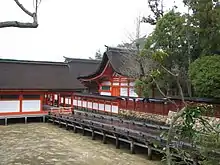 Extending from the sides of the haraiden of the main shrine is a noh stage which dates from 1590.[1] Noh theater performances have long been used to pay homage to the gods through the ritual acting out of key events in Shinto myth.