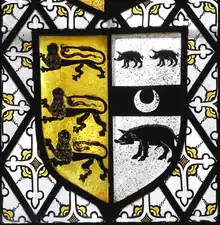 Detail from 19th c. stained glass window in Shillingford St George Church, showing arms of Sir Edmund Carew (1465–1513) of Mohun's Ottery (lions shown here incorrectly as guardant) impaling Huddesfield (Argent, a fess between three boars passant sable (with a crescent argent for difference)), for his wife Katherine Huddesfield (died 1499)