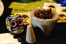 A molcajete ([molkaˈxete]; Mexican Spanish, from Nahuatl molcaxitl) and tejolote (from Nahuatl texolotl) are stone tools, the traditional Mexican version of the mortar and pestle,[1][2] similar to the South American batan, used for grinding various food products.
