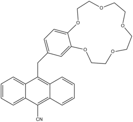 In another XOR logic gate system, the chemistry is based on the pseudorotaxane depicted in Figure 11. In organic solution the electron-deficient diazapyrenium salt (rod) and the electron-rich 2,3-dioxynaphthalene units of the crown ether (ring) self-assemble by formation of a charge transfer complex. An added tertiary amine like tributylamine forms a 1:2 adduct with the diazapyrene and the complex gets dethreaded. This process is accompanied by an increase in emission intensity at 343 nm resulting from freed crown ether. Added trifluoromethanesulfonic acid reacts with the amine and the process is reverted. Excess acid locks the crown ether by protonation and again the complex is de-threaded.[17]