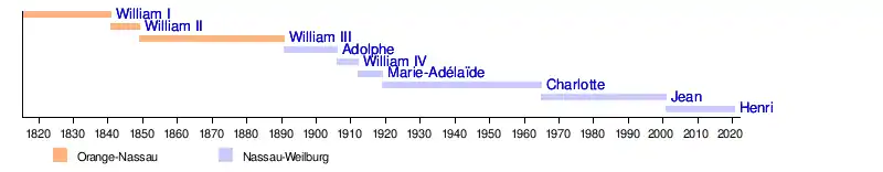 Henri, Grand Duke of LuxembourgJean, Grand Duke of LuxembourgCharlotte, Grand Duchess of LuxembourgMarie-Adélaïde, Grand Duchess of LuxembourgWilliam IV, Grand Duke of LuxembourgAdolphe, Grand Duke of LuxembourgWilliam III of the NetherlandsWilliam II of the NetherlandsWilliam I of the Netherlands