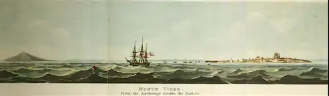 "Monte Video from the Anchorage outside the Harbour" by Emeric Essex Vidal (1820). The earliest securely dated picture of the city.[36]