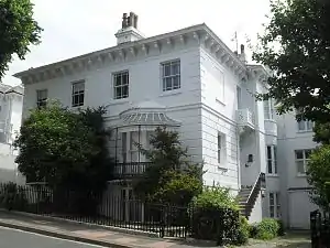 Brighton was connected to the railway network in 1840 when a line to Shoreham-by-Sea opened, followed in 1841 by the completion of the link to London.[32][54] This stimulated growth even further, and the 1840s were a boom period for Montpelier.[1] (Brighton as a whole grew rapidly in the 1840s—between 1841 and 1851, 2,806 new houses were built compared to 437[17] for the preceding decade—but the effect was greater in Montpelier because the station was close by at the foot of West Hill.)[1] During the 1840s, Montpelier Villas and Montpelier Crescent were laid out,[1] several houses were built in Clifton Road, Montpelier Road[37] and Montpelier Terrace were fully built up,[51] Upper North Street became an important route lined with "modest yet grandly treated" houses,[55] the "very attractive composition" of Clifton Terrace was built (it was finished in 1847),[56] Victoria Street was laid out with bay-fronted terraced houses, and Windlesham House was constructed near The Temple.[57][58] This became the New Sussex Hospital in 1921 after alterations by the Clayton & Black architecture firm, but is now flats called Temple Heights.[31]