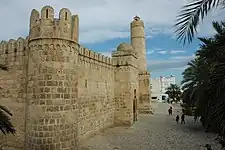 In Ifriqiya, the Ribat of Sousse and the Ribat of Monastir are two military structures dated to the late 8th century, making them the oldest surviving Islamic-era monuments in Tunisia – although subjected to later modifications.[2]: 25 The Ribat of Sousse contains a small vaulted room with a mihrab (niche symbolizing the direction of prayer) which is the oldest preserved mosque or prayer hall in North Africa. Another small room in the fortress, located above the front gate, is covered by a dome supported on squinches, which is the oldest example of this construction technique in Islamic North Africa.[2]: 25 The tall cylindrical tower inside the ribat, most likely intended as a lighthouse, has a marble plaque over its entrance inscribed with the name of Ziyadat Allah I and the date 821, which in turn is the oldest Islamic-era monumental inscription to survive in Tunisia.[lower-alpha 4][2]: 25–26