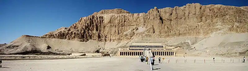 - ↑ An introduction by the Egyptologists and curators at the Metropolitan Museum of Art in New York Catherine H. Roehrig, Renée Dreyfus, and Cathleen A. Keller: 'During this period Egyptian artists reinterpreted the traditional forms of art and architecture with an originality that is exemplified in Hatshepsut's temple at Deir el-Bahri in western Thebes, one of the great architectural wonders of the ancient world'.[9] A statement by the archaeologist Dieter Arnold: 'A masterpiece of pharaonic temple architecture and indeed of architecture world wide, the building was certainly designed by one of the greatest temple builders of ancient Egypt'.[10] A commentary by Zbigniew Szafrański, former director of the Polish Archaeological and Conservation Expedition at the Temple of Hatshepsut at Deir el-Bahari: 'An explosion of artistic creativity by Hatshepsut is exemplified in her temple at Deir el-Bahari. Landscape, terraced architecture and sculpture created one of the great architectural wonders of the ancient world. It is a masterpiece of pharaonic temple architecture'.[11]