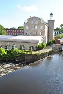 The second mill began producing nails in 1814, and five years later its owner, Ruggles Whiting of Boston, sold it to the owner of the first mill, George Bird, who began using the whole site to manufacture paper.[63] In 1823 it switched to cotton, using the machinery of the former Norfolk Cotton Company. In 1835 a new stone mill was erected.[73] It stands today, and was converted into a condominium complex in 1986–87.[6] Unlike the other mills, which were constructed in a strictly utilitarian style, this factory boasted a date stone reading "1835" and a dome-roofed cupola over the mill bell.[66] Together they stood as a testament to the primacy of the mills in the neighborhood.[66][67]