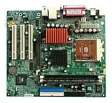 Motherboard for a personal desktop computer; showing the typical components and interfaces which are found on a motherboard. This model follows the Baby AT (form factor), used in many desktop PCs.