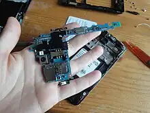 The motherboard of a Samsung Galaxy SII; almost all functions of the device are integrated into a very small board.