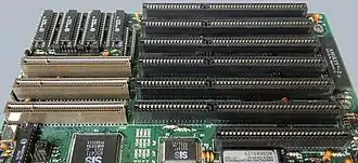 The Octek Jaguar V motherboard from 1993.[1] This board has few onboard peripherals, as evidenced by the 6 slots provided for ISA cards and the lack of other built-in external interface connectors. Note the large AT keyboard connector at the back right is its only peripheral interface.