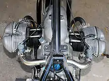 In a flat-twin, or boxer, engine the cylinders are horizontally opposed. The boxer has perfect primary balance, and only a small rocking couple, and unlike a V-twin, regular firing intervals, producing very low vibration levels, without the use of counterbalance shafts. They are usually mounted with a longitudinal crankshaft, with the cylinders protruding into the airstream, so that a flat-twin can satisfactorily be air-cooled. Flat-twins are made by BMW and Ural and historically by Douglas, Marusho, and Hoffmann, among others. The longitudinal mounting makes the flat twin highly suitable for shaft final drive.