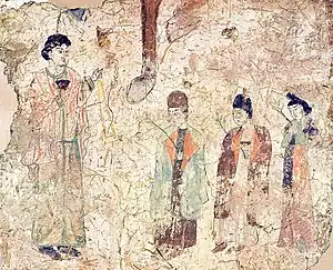 This lost wall painting was sketched by Grünwedel in 1905. It depicts a bearded figure (Jesus) mounted on a donkey holding a processional cross with arms terminating in pearls and entering Jerusalem,[note 1][5] with a female figure (believer) dressing in the Tang dynasty costume. The cross which the figure holding is similar to the processional cross depicted on a lost Manichean banner from Qocho.[note 2][2] The rider has a headdress with a cross set in it and he wears a short upper garment which appears to billow out.
