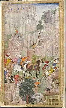 Bullocks dragging siege-guns up hill during Mughal Emperor Akbar's attack on Ranthambhor Fort in 1568.