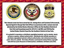 This domain name has been seized by U.S. Immigration and Customs Enforcement, Special Agent in Charge New York Office in accordance with a seizure warrant obtained by the United States Attorney's Office for the Southern District of New York. It is unlawful to reproduce or distribute copyrighted material, such as movies, music, software or games, without authorization. Individuals who willfully reproduce or distribute copyrighted material without authorization, risk criminal prosecution under 18 U.S.C § 2319. First-time offenders convicted of criminal felony copyright laws will face up to five years in federal prison, restitution, forfeiture and a fine.[13]