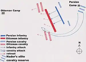 Nader decided, as he continued the 1730–1735 war, that he could win back the territory in Armenia and Georgia by seizing Ottoman Baghdad and then offering it in exchange for the lost provinces, but his plan went badly amiss when his army was routed by the Ottoman general Topal Osman Pasha near the city in 1733.[36] This was the only time that he was ever defeated in battle. Nader decided he needed to regain the initiative as soon as possible to save his position because revolts were already breaking out in Iran. He faced Topal again with a larger force and defeated and killed him. He then besieged Baghdad, as well as Ganja in the northern provinces, earning a Russian alliance against the Ottomans. Nader scored a great victory over a superior Ottoman force at Baghavard and by the summer of 1735, Iranian Armenia and Georgia were his again. In March 1735, he signed a treaty with the Russians in Ganja by which the latter agreed to withdraw all of their troops from Iranian territory,[37][38] those which had not been ceded back by the 1732 Treaty of Resht yet, resulting in the reestablishment of Iranian rule over all of the Caucasus and northern mainland Iran again.