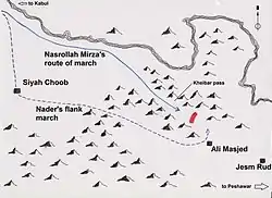 In 1738, Nader Shah conquered Kandahar, the last outpost of the Hotaki dynasty. His thoughts now turned to the Mughal Empire of India. This once powerful Muslim state to the east was falling apart as the nobles became increasingly disobedient and local opponents such as the Sikhs and Hindu Marathas of the Maratha Empire were expanding upon its territory. Its ruler Muhammad Shah was powerless to reverse this disintegration. Nader asked for the Afghan rebels to be handed over, but the Mughal emperor refused. Nader used the pretext of his Afghan enemies taking refuge in India to cross the border and invade the militarily weak but still extremely wealthy far eastern empire,[48] and in a brilliant campaign against the governor of Peshawar he took a small contingent of his forces on a daunting flank march through nearly impassable mountain passes and took the enemy forces positioned at the mouth of the Khyber Pass completely by surprise, utterly beating them despite being outnumbered two-to-one. This led to the capture of Ghazni, Kabul, Peshawar, Sindh, and Lahore. As he moved into the Mughal territories, he was loyally accompanied by his Georgian subject and future king of eastern Georgia, Erekle II, who led a Georgian contingent as a military commander as part of Nader's force.[49] Following the prior defeat of Mughal forces, he then advanced deeper into India, crossing the river Indus before the end of year. The news of the Iranian army's swift and decisive successes against the northern vassal states of the Mughal empire caused much consternation in Delhi, prompting the Mughal ruler, Muhammad Shah, to raise an army of some 300,000 men and march to confront Nader Shah.