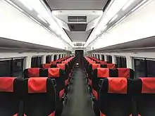 Cars 2 and 3 retain the original seating arrangement with fixed unidirectional non-reclining seating, 2+2 abreast, facing a centre pair of 4-seat bays. Car 1 has reclining/rotating seating, and also retains the original private compartment, seating four persons, branded as "Spa Saloon" (Spa猿~ん, Spa sarūn), a pun on the Japanese word for monkey.[3] The original toilets are retained, but are locked out of use.[5]