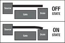 A NEM relay can be fabricated in two, three, or four terminal configurations. A three terminal relay is composed of a source (input), drain (output), and a gate (actuation terminal). Attached to the source is a cantilevered beam that can be bent into contact with the drain in order to make an electrical connection. When a significant voltage differential is applied between the beam and gate, and the electrostatic force overcomes the elastic force of the beam enough to bend it into contact with the drain, the device "pulls in" and forms an electrical connection. In the off position, the source and drain are separated by an air gap. This physical separation allows NEM relays to have zero current leakage, and very sharp on/off transitions.[3]