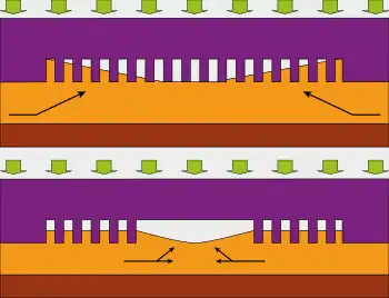 Nanoimprint proximity effect. Top: Array of depressions is more quickly filled at the edge than the center, resulting in less imprinting at the center of the array. Bottom: The wide space between two groups of protrusions tends to be filled slower than the narrow spaces between the protrusions, resulting in the formation of holes in the unpatterned area.