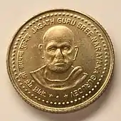 On 21 August 1967, Narayana Guru was commemorated on an Indian postage stamp of denomination 15 nP.[52] Another commemorative stamp on him was issued by Sri Lanka Post on 4 September 2009.[53] The Reserve Bank of India issued two sets of commemorative coins depicting Guru's image, each valued at 5 and 100 respectively, on the occasion of his 150th birth anniversary.