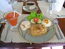 Nasi goreng (/ˌnɑːsi ɡɒˈrɛŋ/; Indonesian pronunciation: [ˈnasi ˈɡorɛŋ]) is a Southeast Asian fried rice dish, usually cooked with pieces of meat and vegetables. One of Indonesia's national dishes,[1][2] it is also eaten in Malay-speaking communities in countries such as Malaysia, Singapore and Brunei, and has gained popularity in Sri Lanka through migrations from the Indonesian Archipelago,[3] in countries like Suriname via Indonesian immigrant communities,[4] and in the Netherlands through its colonial ties with Indonesia.[5] Nasi goreng is distinguished from other Asian fried rice preparations by its distinct smoky aroma, and caramelised yet savoury undertones of flavour. There is no single defined recipe for nasi goreng, and its composition and preparation varies greatly from household to household.