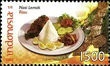 An Indonesian stamp depicting nasi lemak as a local dish of Riau province.