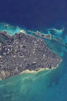 Nassau (/ˈnæsɔː/ NASS-aw) is the capital and largest city of The Bahamas. It is located on the island of New Providence, which had a population of 246,329 in 2010, or just over 70% of the entire population of The Bahamas.[2] As of April 2023, the preliminary results of the 2022 census of the Bahamas reported a population of 296,522 for New Providence, 74.26% of the country's population.[4] Nassau is commonly defined as a primate city, dwarfing all other towns in the country.[5] It is the centre of commerce, education, law, administration, and media of the country.