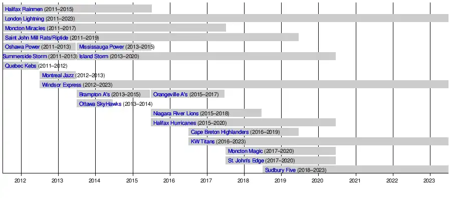 The league grew to nine teams in the 2013–14 season by adding the Brampton A's and Ottawa Skyhawks, while the Montreal Jazz folded. Two teams relocated within their same regions with Oshawa Power moving to Mississauga and Summerside to Charlottetown as the Island Storm. The league returned to eight teams the following season due to Ottawa falling below league standards and failing to repay a loan to the league.