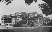 During World War II, American forces shelled the building during the Battle of Manila in 1945 to flush out Japanese forces who had turned it into a stronghold.[6] Most of the structure was beyond repair, except for the still-standing central portion.[7] With the inauguration of the Republic of the Philippines in 1946, the building was reconstructed to be the home of Congress. It was rebuilt by the U.S. Philippine War Damage Corporation to the same dimensions but with less interior and exterior ornamentation.[4] Reconstruction began in 1949, while the Congress moved back the same year. The two wings of the building were completed in 1950.[7] The building was rebuilt mostly from memory, with the aid of a few remaining blueprints.