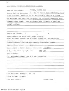 On December 27, 1963, Edward Fields was brought to the US Secret Service's attention as a possible threat against protected individuals. This was divulged as part of the JFK file release. The FBI considered that Fields was "one step removed from being insane."[9]