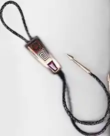 Metal jewelry came to the Plains through Spanish and Mexican metalsmiths and trade with tribes from other regions. Southern Plains Native Americans adopted metalsmithing in the 1820s. They typically cut, stamped, and cold hammered German silver, a nickel alloy.[14] Plains men adopted metal pectorals and armbands.[15] In the late 19th and early 20th centuries, members of the Native American Church revealed their membership to others through pins with emblems of peyote buttons, water bird, and other religious symbols.[16] Bruce Caesar (Sac and Fox-Pawnee) is one of the most prolific Southern Plains metalsmiths active today and was awarded the NEA's National Heritage Fellowship in 1998.[17] US Senator Ben Nighthorse Campbell (Northern Cheyenne) is an accomplished silversmith.[18]