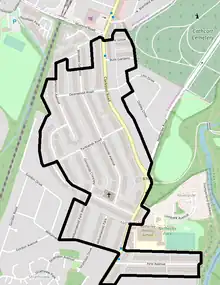 The early years of the 20th century saw the first phase of urbanisation. New housing developments, typically red sandstone terraces, began to eat up former agricultural land. Due to building restrictions as a result of the First World War, however, it was not until the 1920s that the majority of residential streets off the main artery were fully developed as they appear today.[2] Netherlee in the mid-1930s was mostly as it is today, with the construction of the parish church, primary school and the MacLaren Place building.