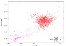 PP-dot diagram for known rotation-powered pulsars (red), anomalous X-ray pulsars (green), high-energy emission pulsars (blue) and binary pulsars (pink)