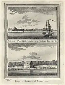New Amsterdam has its origins in a village which grew up alongside Fort Nassau in the 1730s and 1740s. The first Nieuw Amsterdam, as it was called then, was situated about 90 km (56 mi) up the Berbice River on the right bank. Before the 1763 slave uprising it comprised a Court of Policy building, a warehouse, an inn, two smithies, a bakery, a Lutheran church and a number of houses, among other buildings. Built in 1740 by the Dutch, New Amsterdam was first named Fort Sint Andries. It was made seat of the Dutch colonial government in 1790. In 1803 it was taken over by the British.[3]