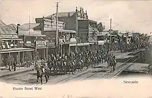 A parade of mounted soldiers along Hunter Street, c. 1908