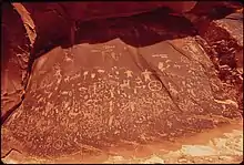 The first carvings at the Newspaper Rock site were made around 2,000 years ago, left by people from the Archaic, Anasazi, Fremont, Navajo, Anglo, and Pueblo cultures.[3]