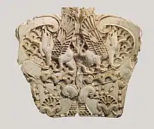 In addition to plaques, many small ivory carvings of female heads have been found at Nimrud, most only one or two inches in height, but a few over 5 inches tall. Many of these heads wear a flat cap which is very similar to the flat caps depicted on much earlier ivories from the Tel Megiddo site in modern Israel.[11] Another common carved form found at Nimrud comprises figurines of two naked females joined back to back, which are thought to have been used either as handles for fans or mirrors, or as a decorative element on furniture.[11]