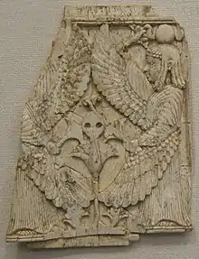 The Nimrud ivories are a large group of small carved ivory plaques and figures dating from the 9th to the 7th centuries BC that were excavated from the Assyrian city of Nimrud (in modern Ninawa in Iraq) during the 19th and 20th centuries. The ivories mostly originated outside Mesopotamia and are thought to have been made in the Levant and Egypt, and have frequently been attributed to the Phoenicians due to a number of the ivories containing Phoenician inscriptions.[2] They are foundational artefacts in the study of Phoenician art, together with the Phoenician metal bowls, which were discovered at the same time but identified as Phoenician a few years earlier. However, both the bowls and the ivories pose a significant challenge as no examples of either – or any other artefacts with equivalent features – have been found in Phoenicia or other major colonies (e.g. Carthage, Malta, Sicily).[3]